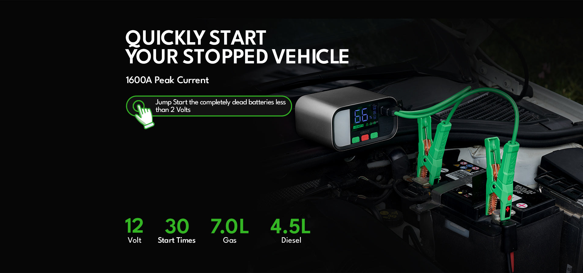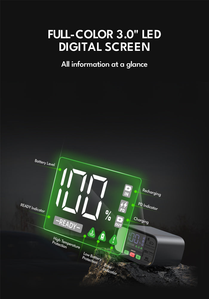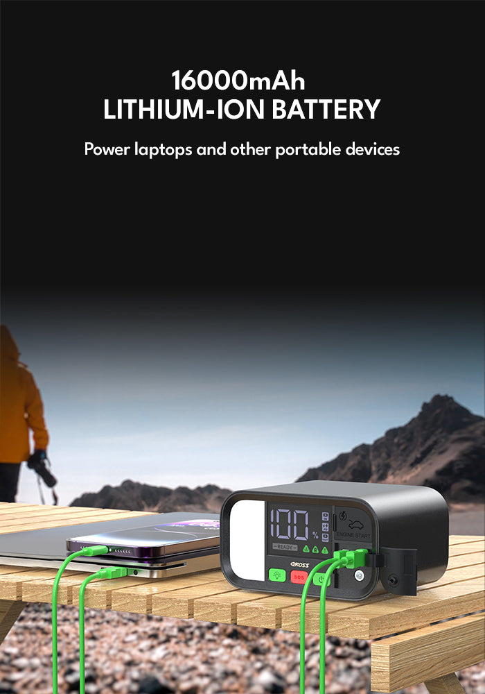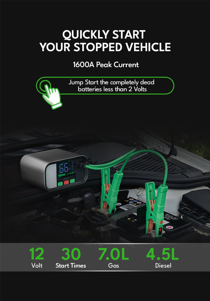 The CAROSS 12V Smart Jump Starter delivers an impressive 1600A of peak power and packs a 16,000mAh lithium-ion battery to bring your car, SUV, and truck back to life in seconds. With its world-exclusive Smart Connect™ technology and green non-polarized Smart lamps™, it's foolproof and safe for anyone to use. Built with a sleek aluminum casing and soft-touch TPU injection, it not only looks premium but also feels durable in your hands. The 3-inch smart digital screen makes everything clear at a glance. Every T19SC jump starter kit comes complete with a rugged carrying case, a DC adapter, and a powerful PD 65W ultra-fast charger- giving you everything you need for convenience at home or on the road.