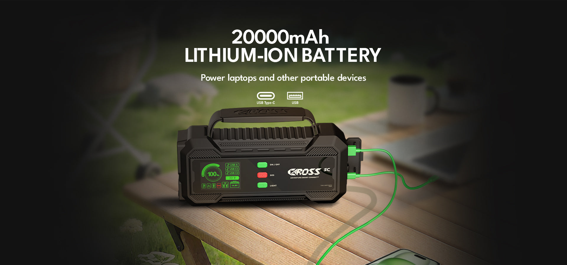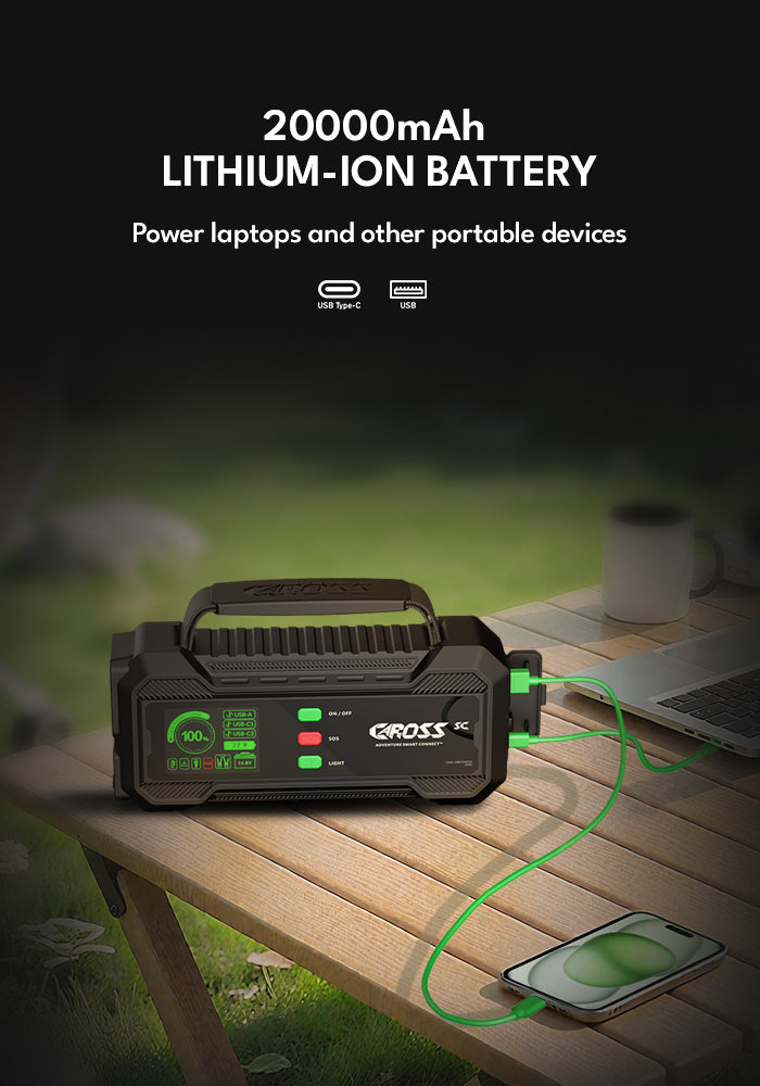 • 20 000 mAh Lithium-Ion Battery – Doubles as a power bank for laptops, phones, and drones