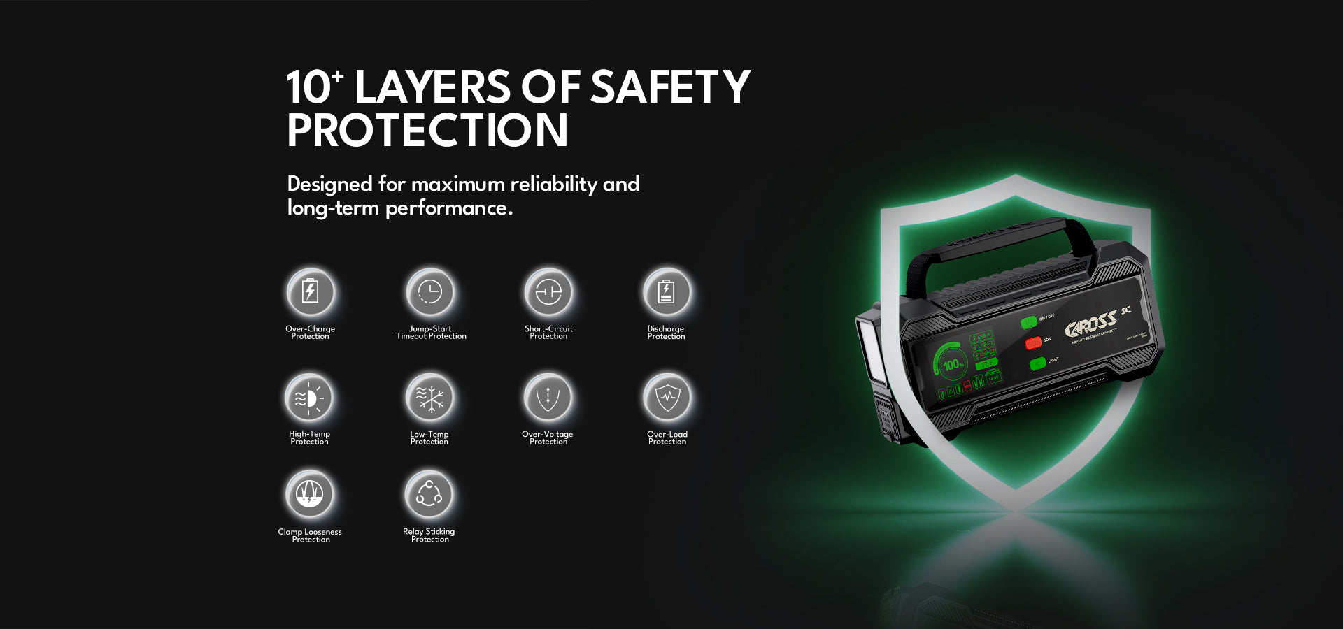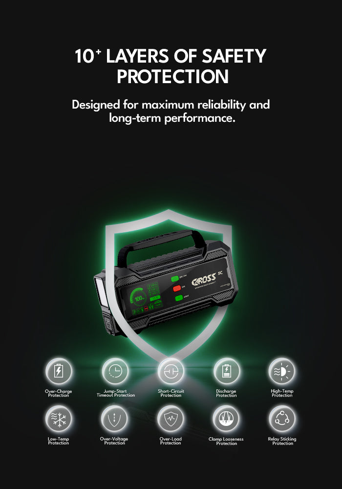 • 10+ Advanced Safety Protections – Prevent spark, overheat, and reverse polarity damage