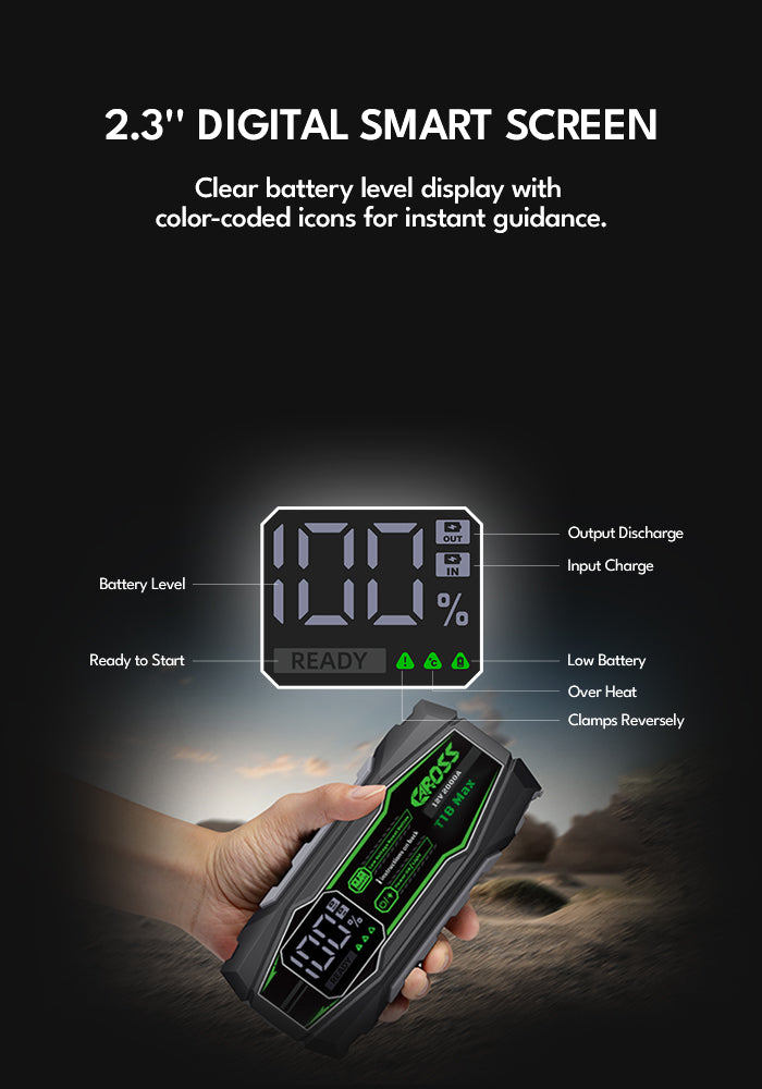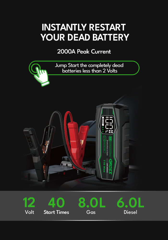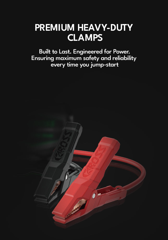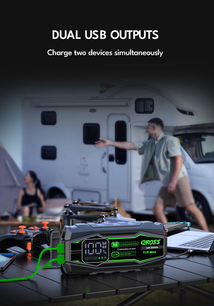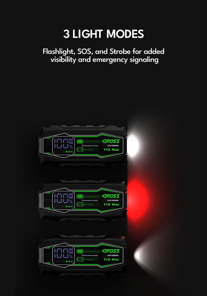 Never get stranded again. The CAROSS T18 Max is a heavy-duty 2000A Portable Jump Starter and Power Bank for 8.0L Gas / 6.0L Diesel engines, perfect for cars, trucks, and SUVs. It features a 20,000mAh Portable Power Bank, Spark-Proof Smart Clamp Technology, and Boost Mode for dead or low-voltage batteries—making it your safe, reliable roadside emergency solution for any trip.