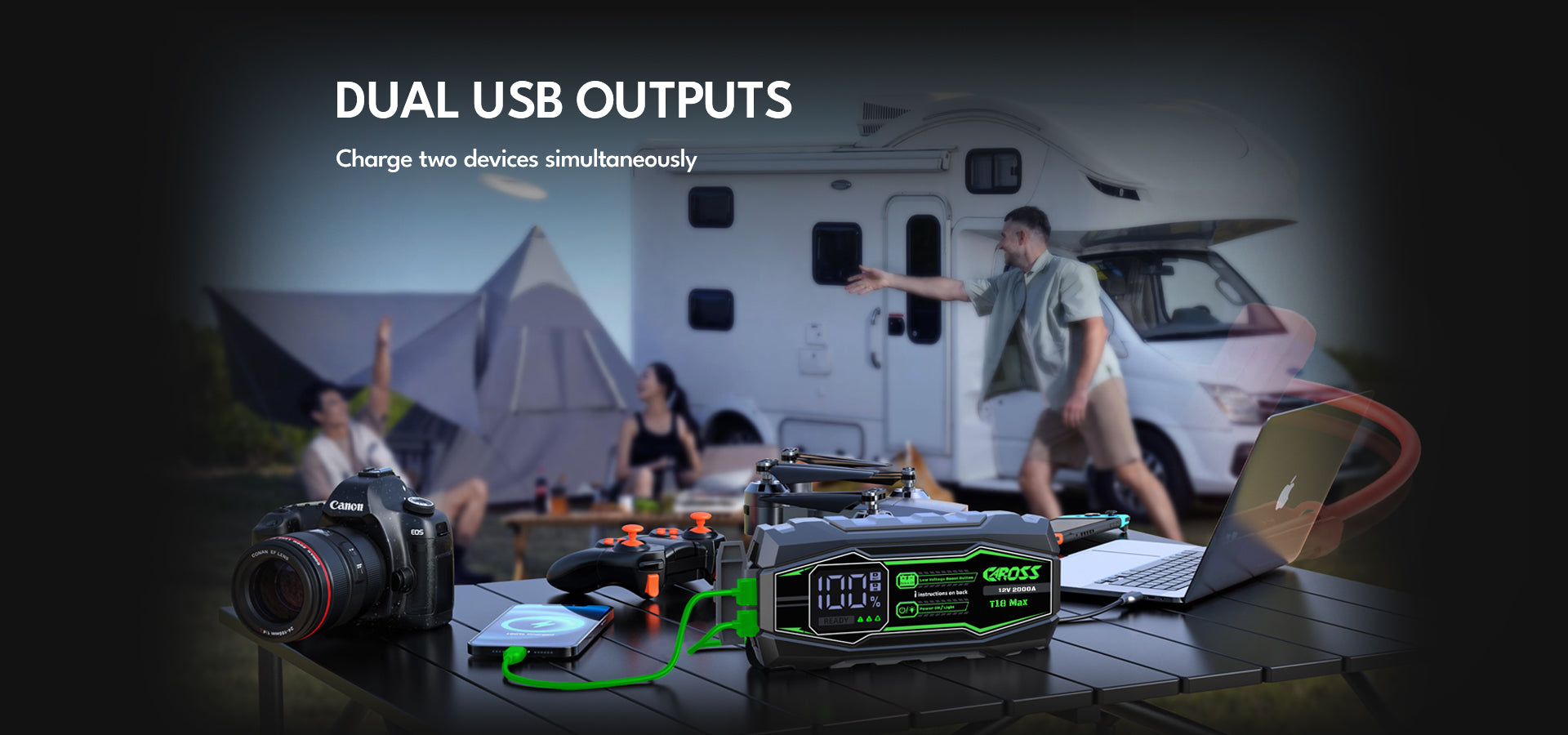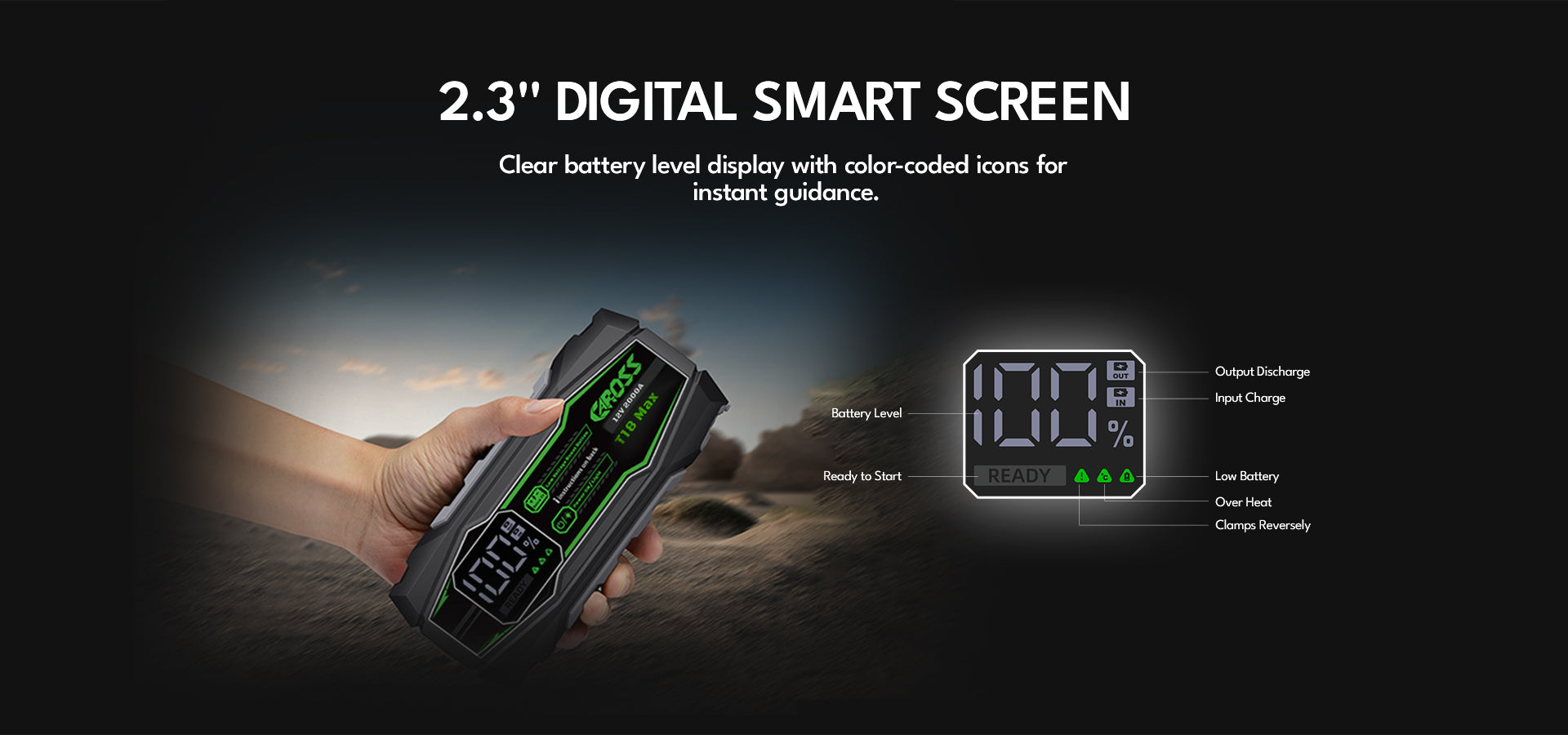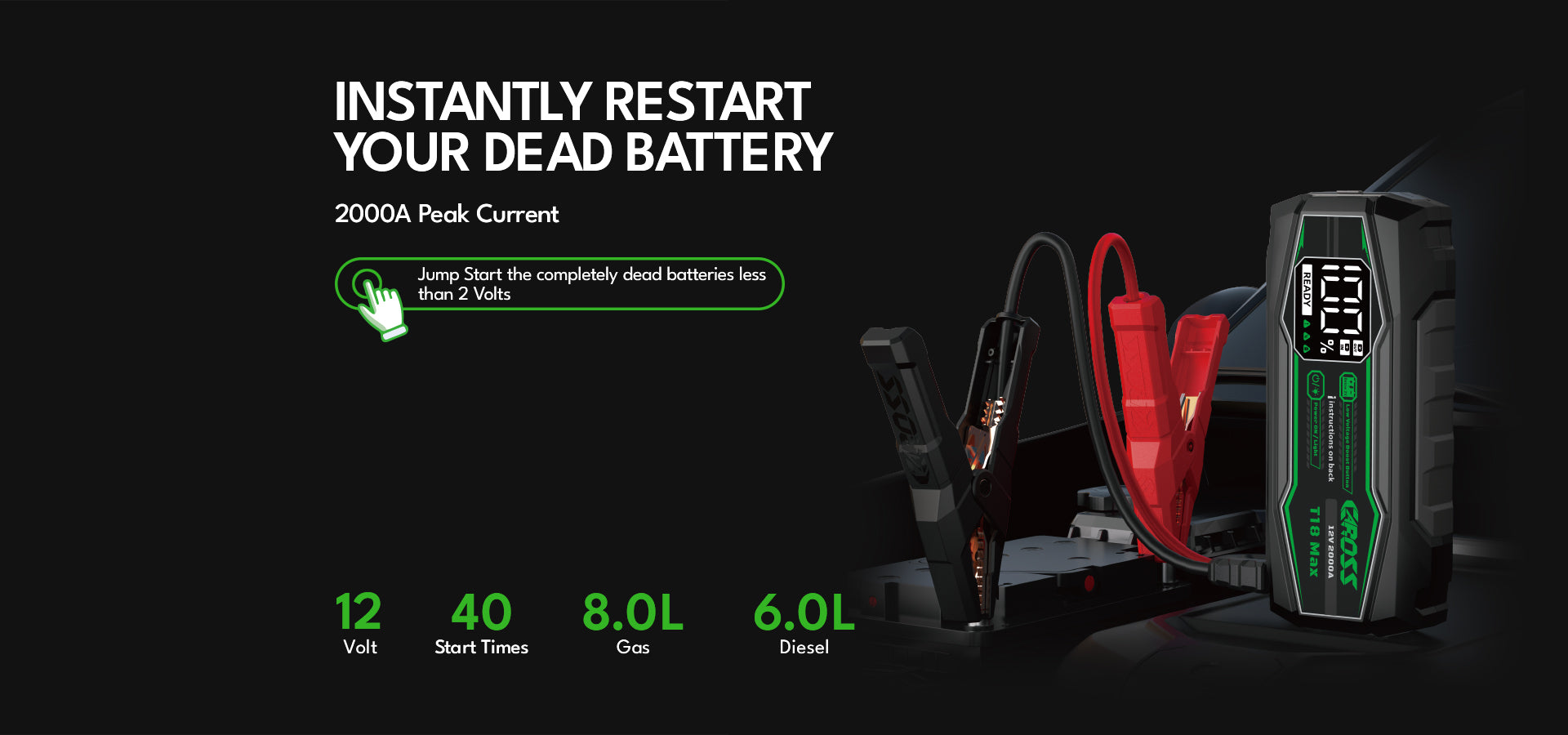 Never get stranded again. The CAROSS T18 Max is a heavy-duty 2000A Portable Jump Starter and Power Bank for 8.0L Gas / 6.0L Diesel engines, perfect for cars, trucks, and SUVs. It features a 20,000mAh Portable Power Bank, Spark-Proof Smart Clamp Technology, and Boost Mode for dead or low-voltage batteries—making it your safe, reliable roadside emergency solution for any trip.